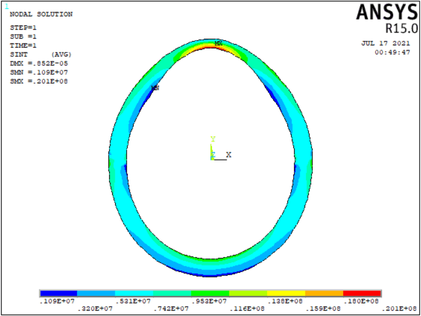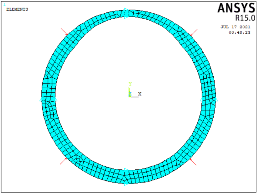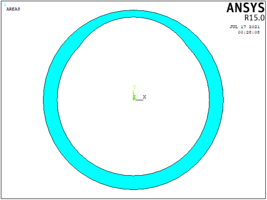 As shown in Fig.1, the outer ring is the casing, and the middle is the drill pipe. The unworn part of the casing is going to be analyzed. The diameter of the drill pipe is 127mm. the outer diameter of the casing is 177.8mm, and the thickness of the casing is 13.72mm. The steel grade of the casing is N80. The yield strength is 551.6MPa. Poisson’s ratio is 0.3. The elastic modulus is 2.06GPa. The eccentricity is 18.5mm. Perform 2D plane strain analysis using PLANE82 elements.