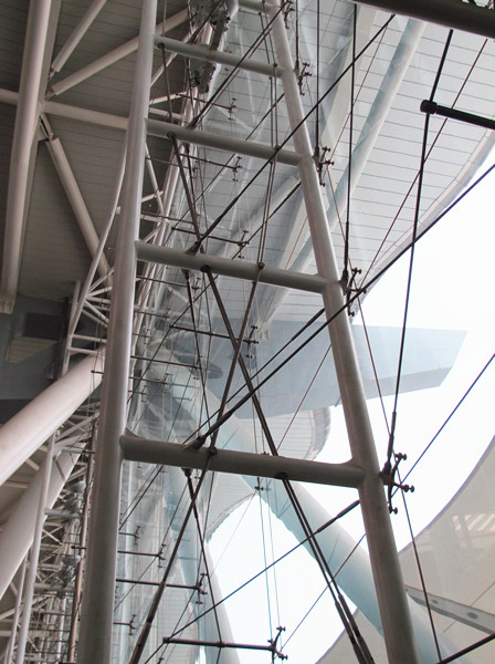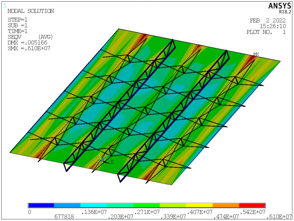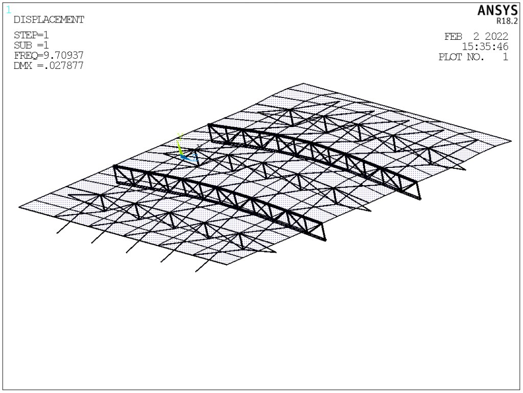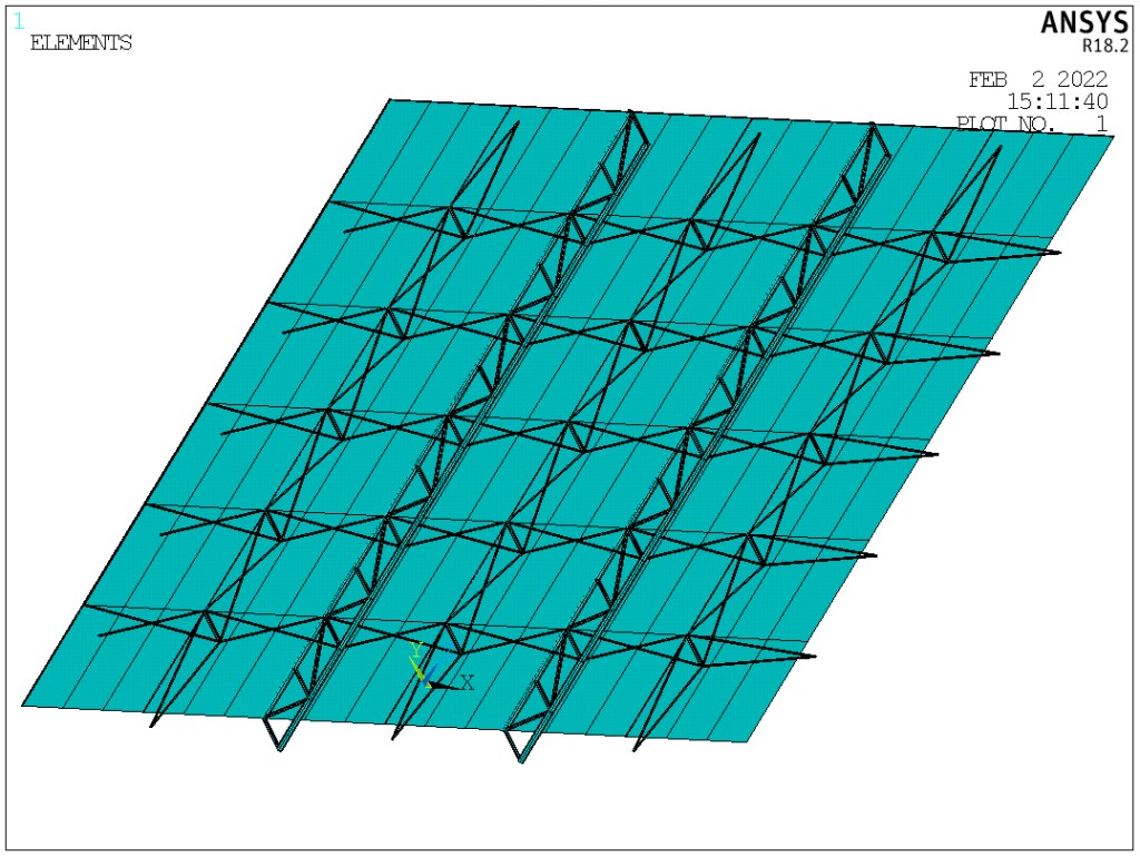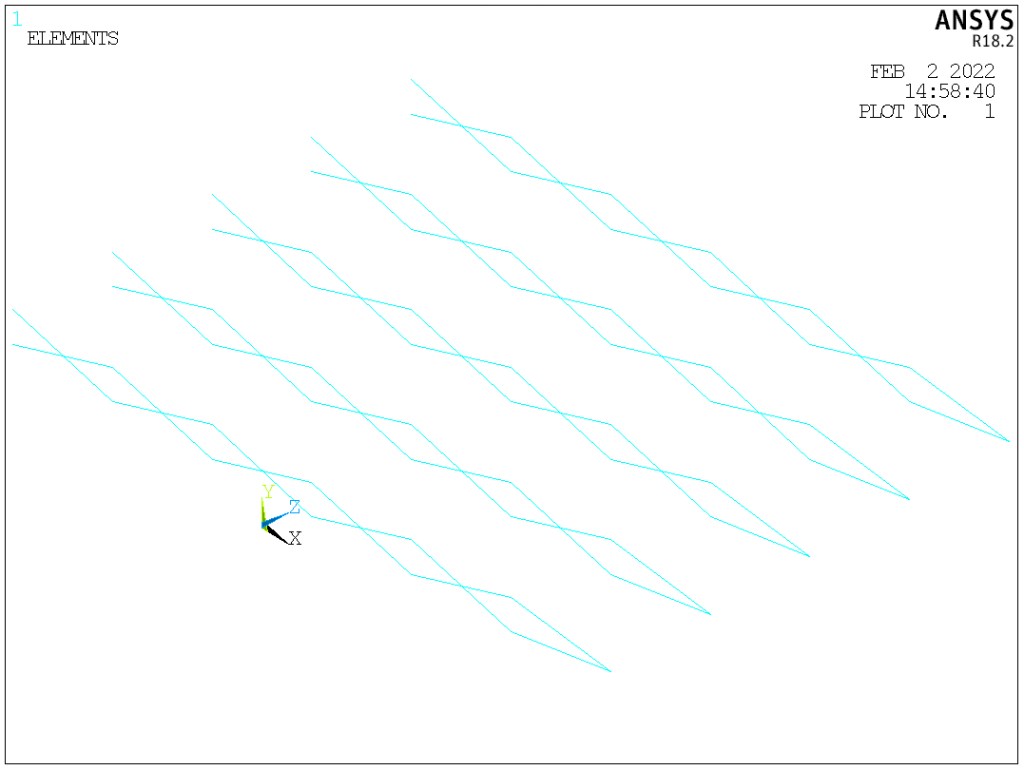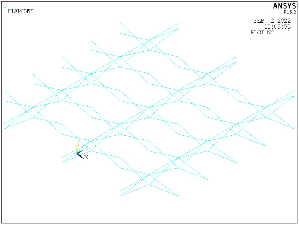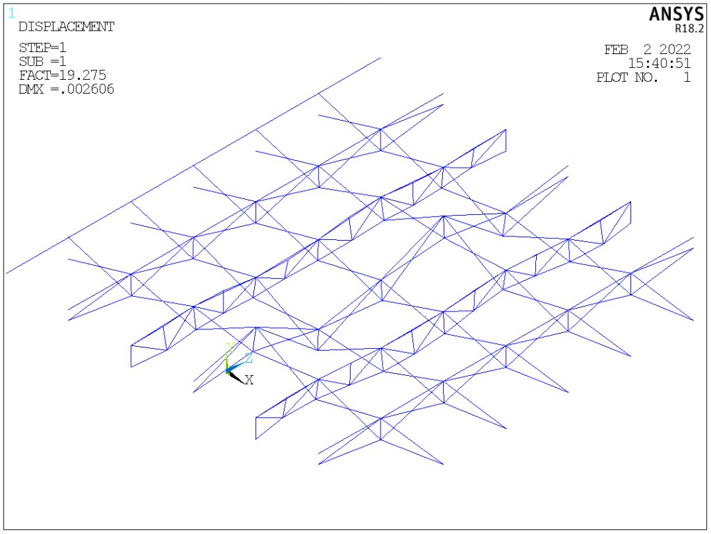 The aim of this problem is to calculate the static response of the glass curtain wall under wind load. Modal analysis and buckling analysis are also carried out. Taking advantage of the geometric feature of the cable-truss structure, LGEN, KGEN, and *DO loop are used when creating the geometry. The APDL of this problem is as follows: