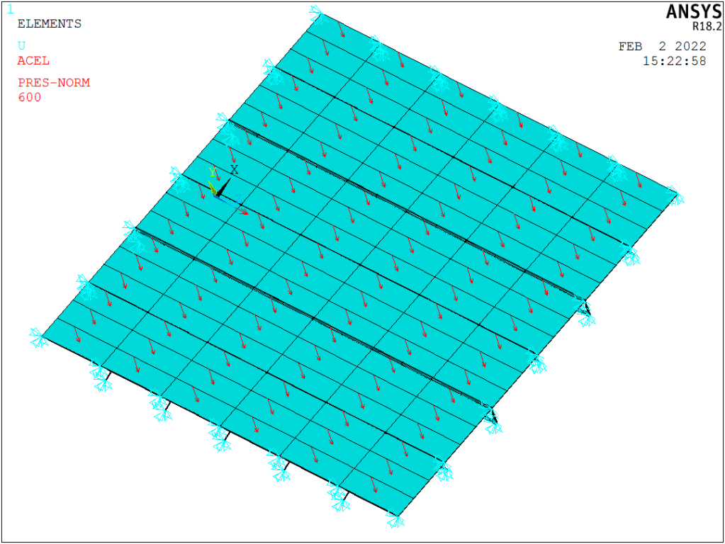 - The glass wall is modeled using SHELL63 elements. Wind load distributes evenly on the surface.