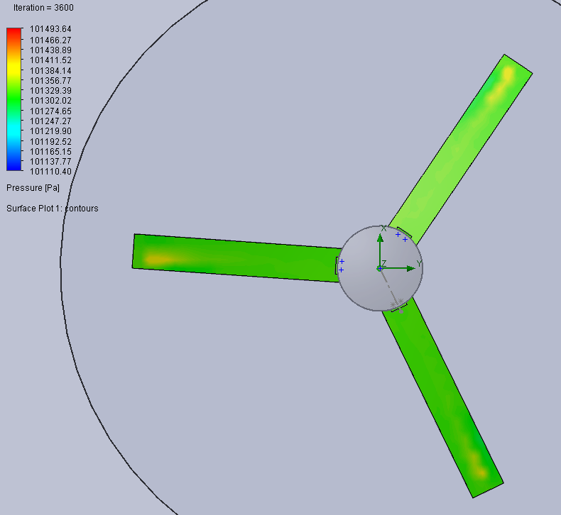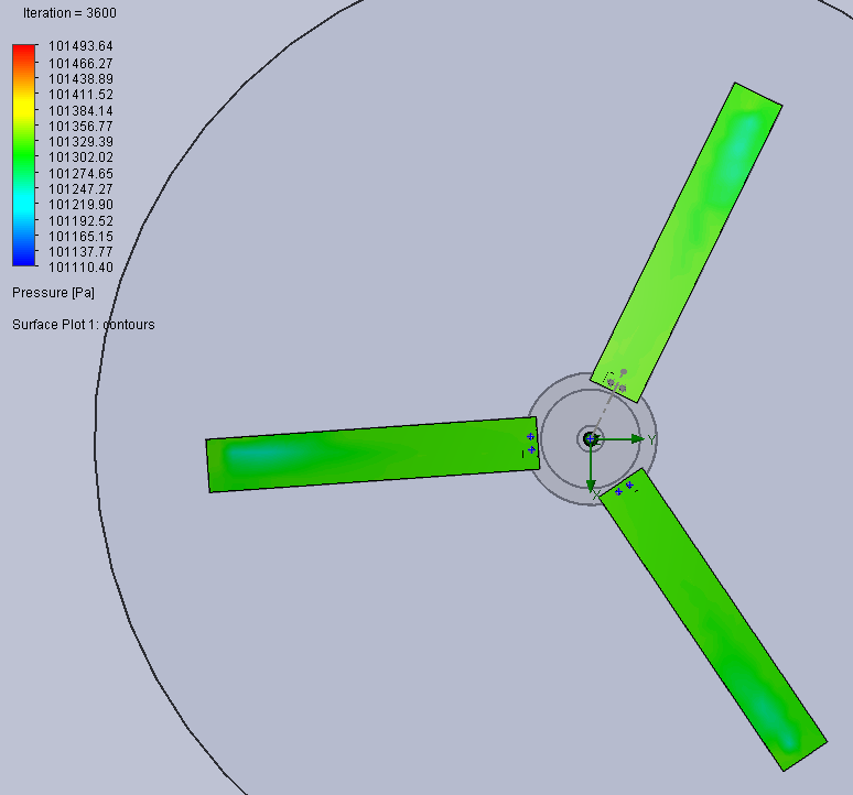 After solving the model, a flow velocity cut plot is shown in Figure 7. Figure 8 and Figure 9 display the pressure surface plot on the bottom side and top side of the blades, respectively. The pressure is lower as the air enters the fan from the top side, and it increases as the air exits the fan from the bottom side. The difference between the static pressure at the fan exit and entrance is referred to as pressure drop.