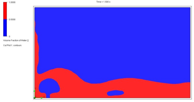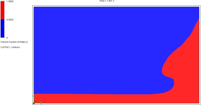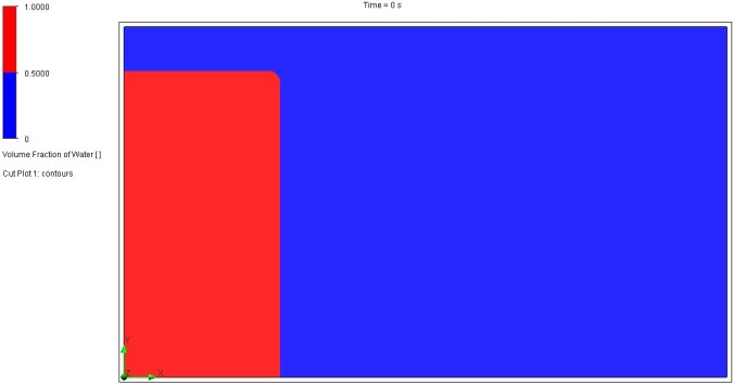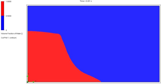 In this post, we are going to use the free surface option to solve for a dam-break problem. The body of water is initially contained in a region on the left side. Then the water is released suddenly and starts to flow into the empty regions of the tank. Water is free to spill from the top of the tank. The following slide show illustrates the water flow in the first 1.5 seconds, with blue regions indicating air and red regions indicating water.