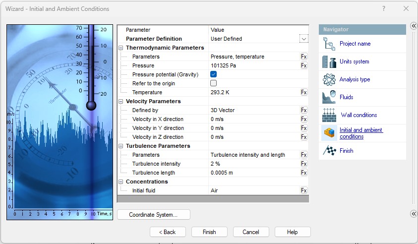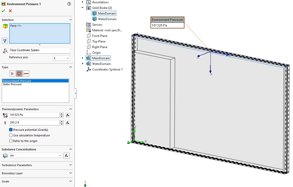 As water is free to spill over the tank from above, the top of the tank is set to pressure opening – environmental pressure. Under ‘Substance Concentrations’, the initial fluid distribution is specified as ‘Air’, which is a constant distribution (see Figure 6).