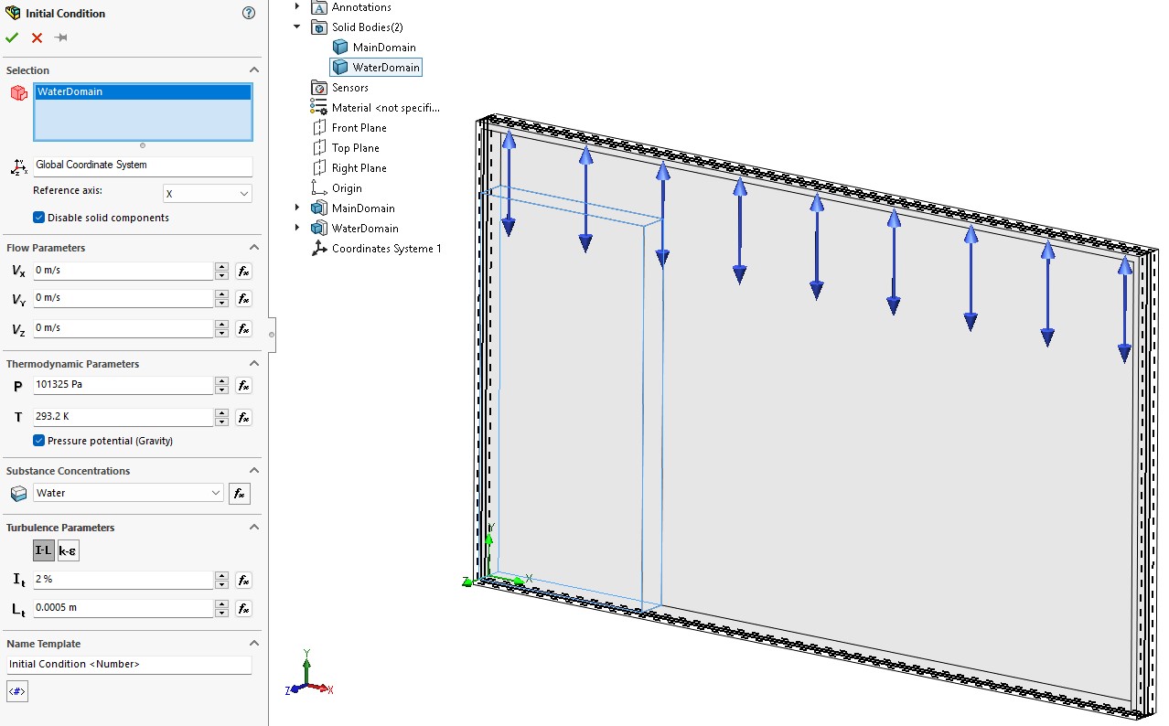 For initial conditions, select the solid body representing the water domain and make sure to ‘Disable solid components’. Under ‘Substance Concentrations’, the initial fluid distribution is specified as ‘Water’, which is also a constant distribution (see Figure 7).