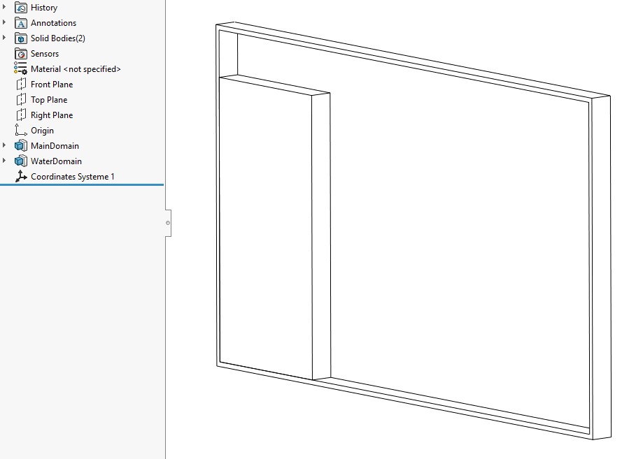 The geometric model of this problem is shown below. Since a 2D computational domain will be used, two solid bodies with limited depth have been created, with one representing the water domain and the other representing the tank.