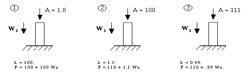 Consider the example of a column with a self-weight W0 and an externally applied load A as shown in Figure 1. Instead of applying unit load A=1.0, users may iterate on the buckling solution, adjusting A until the load multiplier becomes 1.0 or nearly 1.0. From Figure 1, A is gradually increased from 1 to 111 until λ equals 0.99, so that the final load leading to buckling is F=0.99*111+0.99* W0