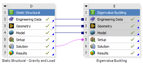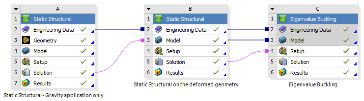 In the second workflow, Static Structural analysis #1 is performed with gravity applied only. Then Static Structural analysis #2 is performed on the deformed geometry, with the unit load applied. Finally, the results are transmitted to the Eigenvalue Buckling analysis to calculate the load multiplier. This process is shown in Figure 3.