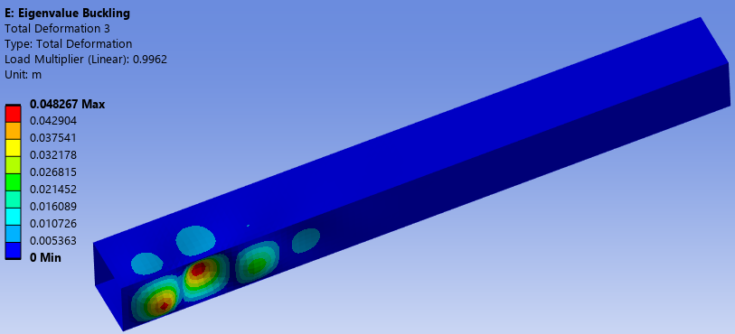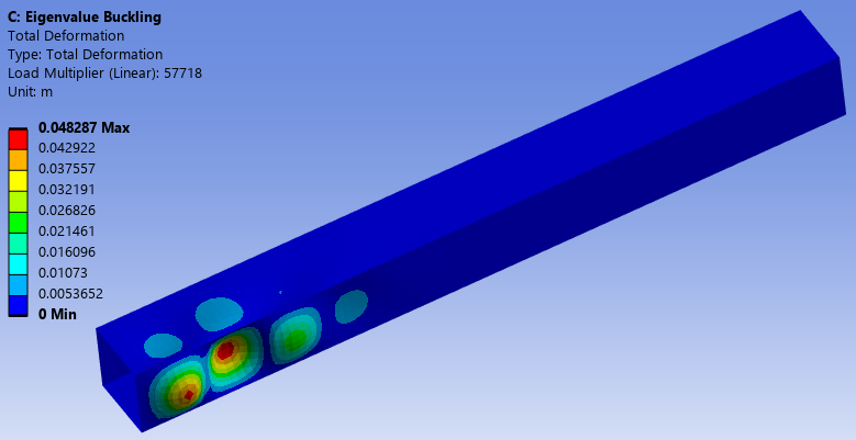 When taking workflow #2, the gravity is applied in the first Static Structural analysis (see Figure 6), then a unit load is applied in the second Static Structural analysis (see Figure 7). The load multiplier is calculated to be 57718, which means the final load leading to buckling is F=57718*1+self-weight. The buckling mode is shown in Figure 8, which is practically identical to Figure 5.