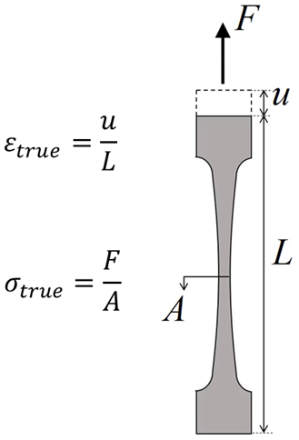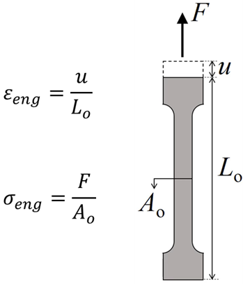 The stress and strain quantities recorded in a standard tensile test are engineering (or nominal) values: stress is calculated using the original cross-sectional area, and strain is referenced to the original gauge length. These are convenient for small deformations, but they become increasingly inaccurate as the specimen necks and the cross-section shrinks significantly.