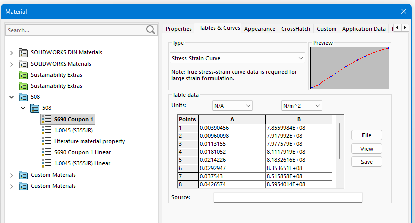 In SolidWorks Simulation, the full stress–strain curve can be entered directly in the material library via the stress–strain data input dialog (Figure 17).