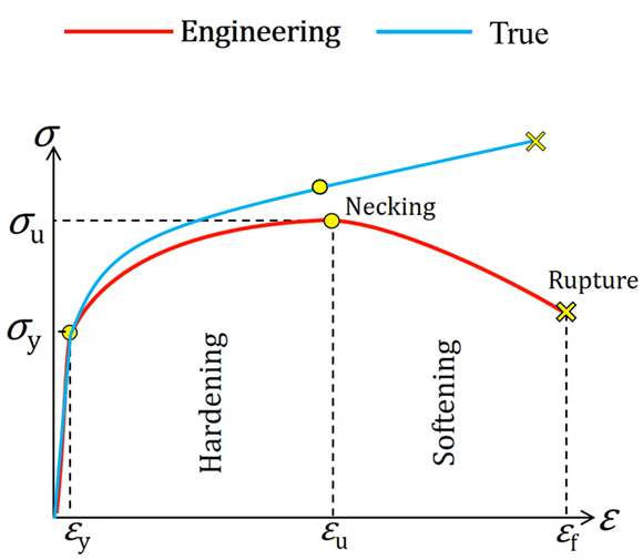 True stress–strain, by contrast, accounts for the instantaneous geometry of the specimen at every point during the test. True stress uses the actual (current) cross-sectional area, and true strain (also called logarithmic strain) is accumulated incrementally. For large-deformation and plasticity analyses, true stress-strain must be used, as it is a more representative measure of the actual material state.