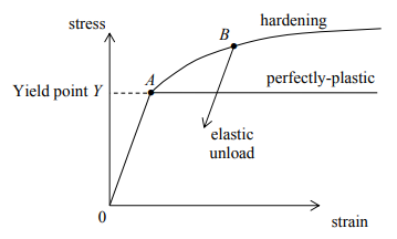 Post-yield behaviour is typically characterized as being either elastic–perfectly plastic or strain hardening behaviour, as shown in Figure 4. In the perfectly plastic case, once the stress reaches the yield point A, plastic deformation ensues, so long as the stress is maintained at Y. If the stress is reduced, elastic unloading occurs. In the hardening case, once yield occurs, the stress needs to be continually increased to drive further plastic deformation. If the stress is held constant, for example at B, no additional plastic strain accumulates, and no elastic unloading occurs either. The yield stress effectively rises with plastic strain.