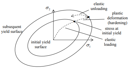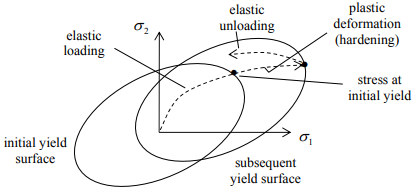 The description of how the yield surface evolves with plastic deformation is called the hardening rule. The two most widely used rules are isotropic hardening and kinematic hardening.