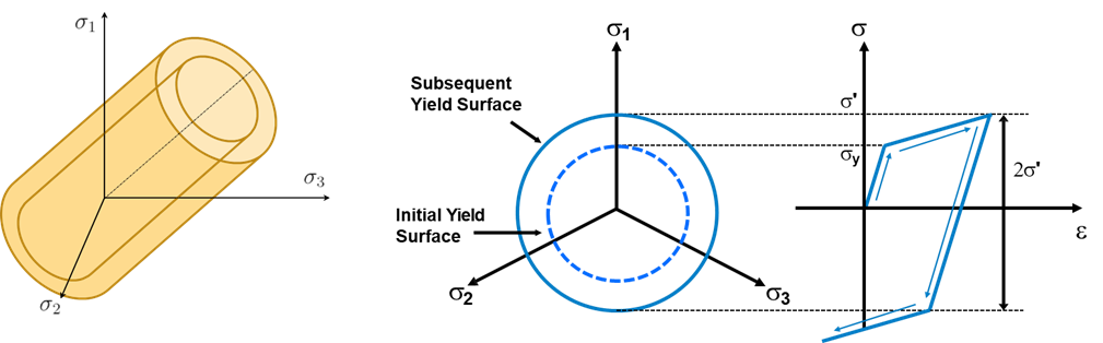 Isotropic hardening is where the yield surface remains the same shape but expands with increasing stress, as shown in Figure 5 and Figure 6. The yield point σ_y keeps increasing while the accumulated plastic strains are pushed further.