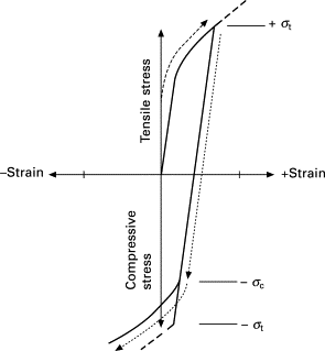 Figure 7. Illustration of the Bauschinger Effect when the direction of straining is reversed as indicated by the arrowed dotted line [1].