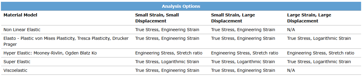 Engineering strain is a small strain measure which is invalid once the strain in the model is no longer ‘small’ (approximately larger than 5%). True strain (also named logarithmic strain) should be used for large strain simulations. Depending on the analysis option and the type of material model used, different types of stress and strain that should be used as input for the stress-strain curve are summarized in the following table: